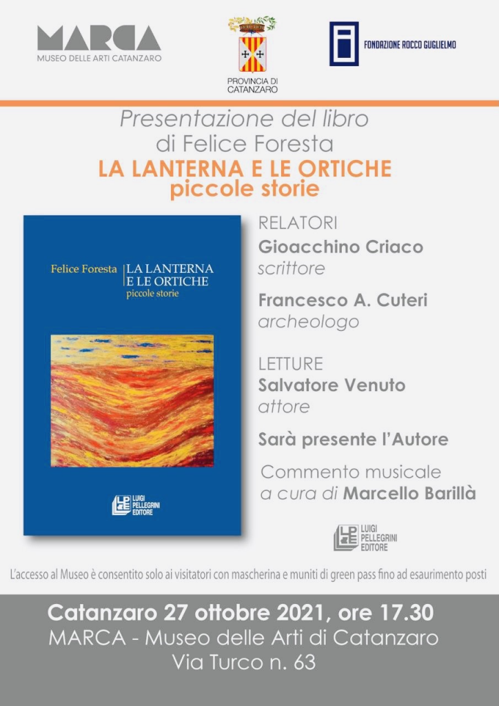 Si terrà il prossimo 27 ottobre, alle ore 17.30, al Museo delle Arti – MARCA di Catanzaro, la presentazione dell’ultimo lavoro di Felice Foresta, “ La lanterna e le ortiche”, Luigi Pellegrini Editore.