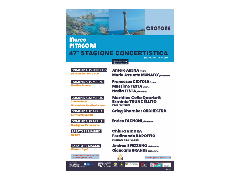 CROTONE — Domenica 15 febbraio, alle ore 19:00, prenderà ufficialmente il via la 47ª Stagione Concertistica dell’Associazione Musicale Maurizio Quintieri, ospitata negli spazi del Museo Pitagora e sostenuta dal Ministero della Cultura (MIC) in collaborazione con il Consorzio Jobel. La rassegna, articolata in sette appuntamenti tra febbraio e maggio 2026, conferma l’impegno dell’associazione nel coniugare valorizzazione del patrimonio locale e programmi di alto profilo artistico.