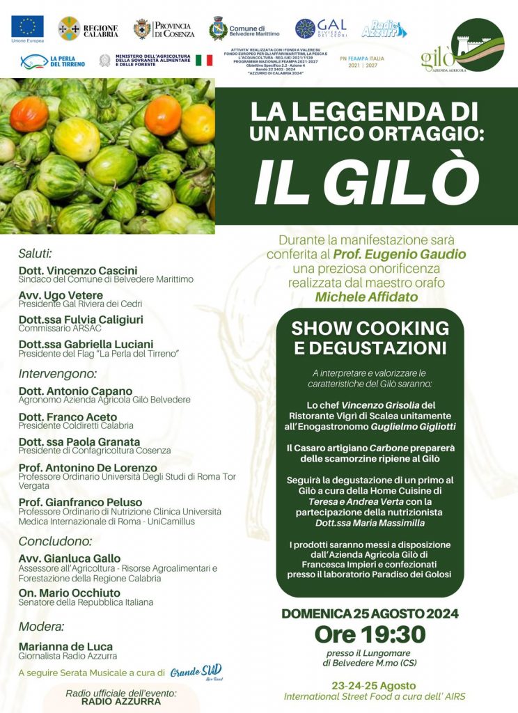 Il programma proseguirà con una serie di interventi da parte di esperti e rappresentanti del settore. Il Dott. Antonio Capano, Agronomo dell’Azienda Agricola Gilò di Belvedere, fornirà una panoramica approfondita sul ruolo e l’importanza del Gilò nella tradizione agricola e nell’economia locale. A seguire, interverranno Franco Aceto, Presidente di Coldiretti Calabria, e Paola Granata, Presidente di Confagricoltura Cosenza. Il Prof. Antonino De Lorenzo dell’Università degli Studi di Roma Tor Vergata e il Prof. Gianfranco Peluso dell’Università Medica Internazionale di Roma – UniCamillus presenteranno approfondimenti accademici e scientifici sul Gilò, evidenziandone le caratteristiche e il valore. Le conclusioni saranno affidate all’Assessore all’Agricoltura, Risorse Agroalimentari e Forestazione della Regione Calabria, Gianluca Gallo, e al Senatore Mario Occhiuto.
