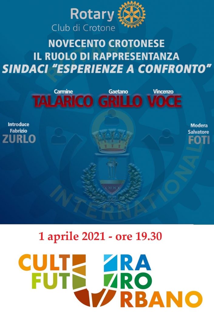 Il Rotary Club di Crotone, nell’ambito del progetto Biblioteca Casa di Quartiere “Bibliotec@…un libro ovunque”, (Piano Cultura Futuro Urbano del Mibact), promosso dall’Assessorato alla Cultura del Comune di Crotone promuove un incontro pubblico in cui i sindaci della città, Carmine Talarico, Gaetano Grillo e Vincenzo Voce, converseranno sulle loro esperienze amministrative inquadrate nel periodo storico in esame.