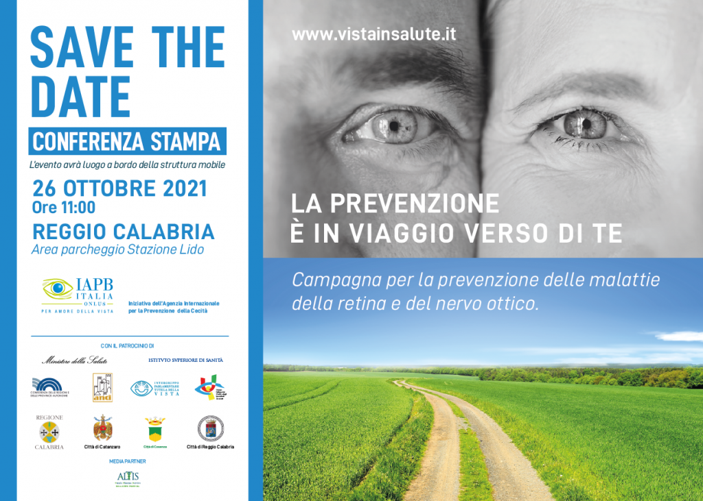 “Vista in salute” è un progetto itinerante promosso dall’Agenzia Internazionale per la Prevenzione della Cecità-IAPB Italia Onlus e prevede la permanenza dal 26 al 27 ottobre a Reggio Calabria, area parcheggio Stazione Lido dalle 10 alle 18, di una grande struttura ambulatoriale mobile – un tir hi-tech – dotata di più postazioni, presso la quale sarà possibile effettuare gratuitamente controlli oculistici ad alta tecnologia su retina e nervo ottico, riservati a persone di età superiore ai 40 anni. www.vistainsalute.it