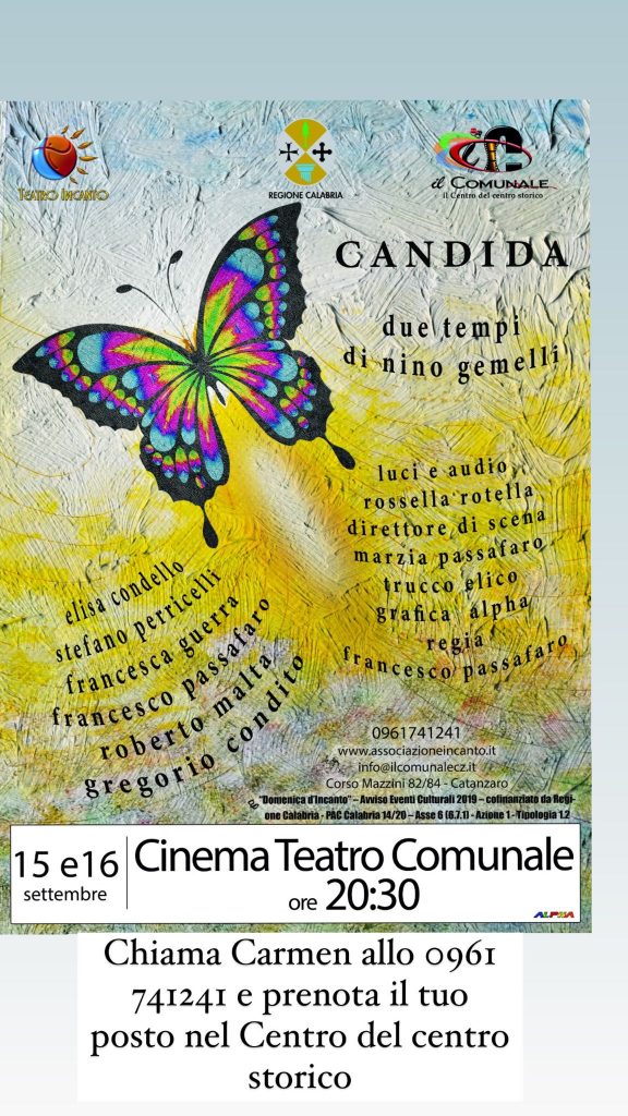 Catanzaro ; Mercoledì 15 e giovedì 16 settembre alle 20.30 al Teatro Comunale il “Teatro Incanto” mette in scena “Candida” di Nino Gemelli