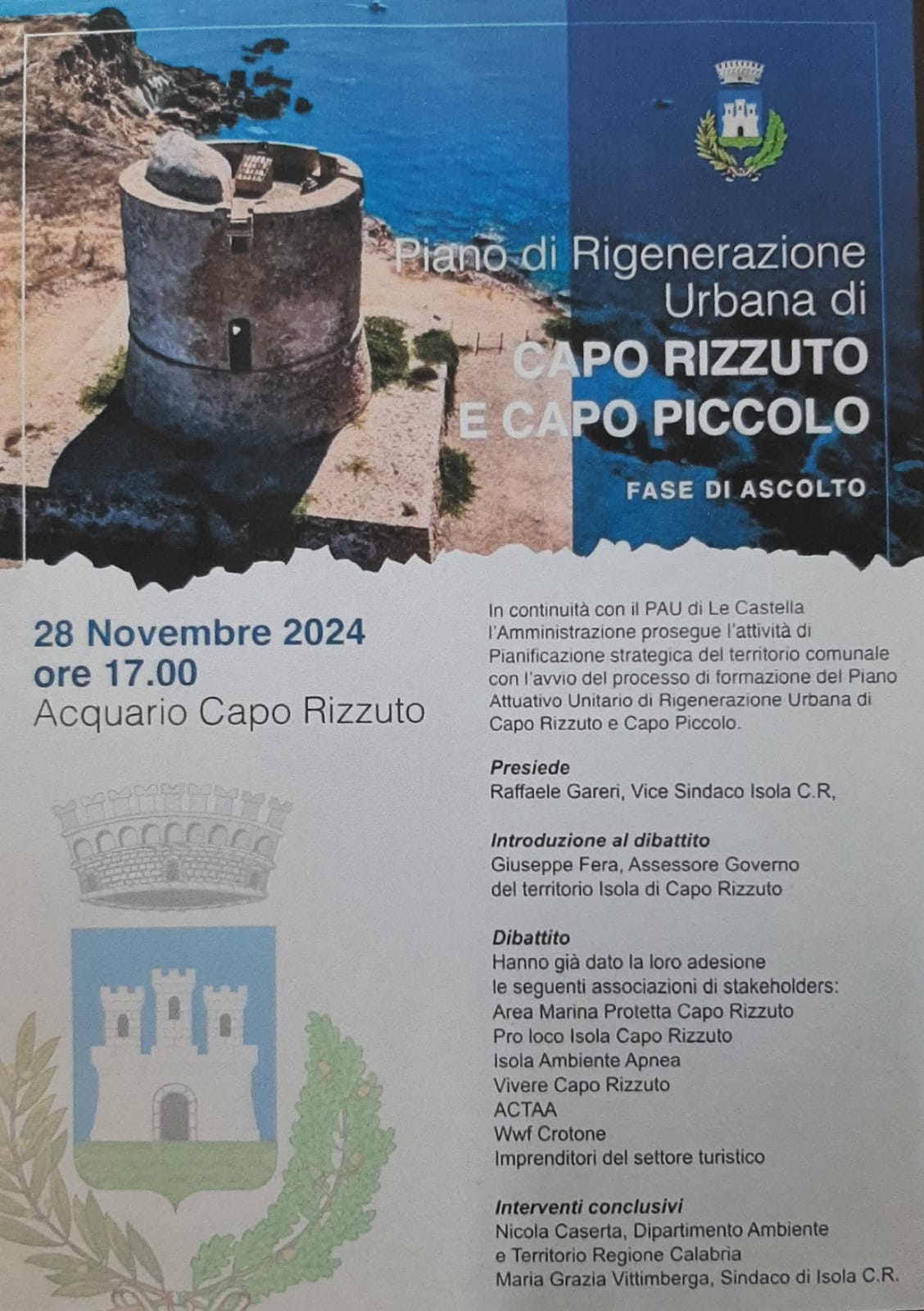 Leggi tuttoIeri, presso l’Acquario di Capo Rizzuto, si è tenuto il primo incontro dedicato al Piano Attuativo Unitario (PAU) di Capo