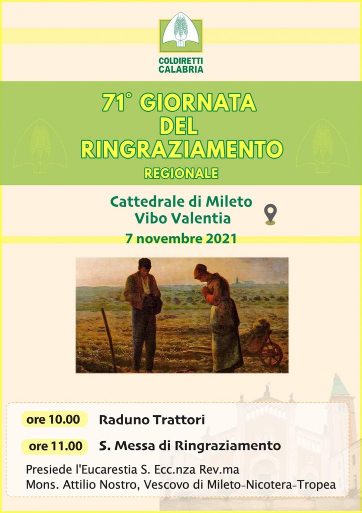 C’è grande attesa per la 71esima Giornata Regionale del Ringraziamento che in Calabria sarà celebrata domenica 7 novembre p.v. nella Cattedrale di Mileto; una ricorrenza che dal 1951, in aderenza al Messaggio dei Vescovi Italiani viene festeggiata dalla Coldiretti. Presiederà la liturgia mons. Attilio Nostro Vescovo di Mileto-Nicotera-Tropea e concelebrerà il Consigliere Ecclesiastico regionale della Coldiretti don Pietro Pulitanò insieme ad altri sacerdoti. La significativa iniziativa vede coinvolti la parrocchia di San Nicola della Basilica Cattedrale, il coro “San Gerlando” e il movimento “Laudato Sì” di Mileto. Il programma prevede che dalle ore 9.00 saranno allestiti gli stand di Campagna Amica con i prodotti del territorio e il contestuale arrivo dei mezzi  agricoli. Prosegue poi alle 11.00 con la Celebrazione Eucaristica e l’offerta dei prodotti della terra e del lavoro dell’uomo, al termine la benedizione degli agricoltori, dei mezzi agricoli, degli animali e di alcune piante di olivo Leucocarpa o olivo della Madonna che saranno piantate davanti la chiesa. La Giornata sarà incentrata sul tema del messaggio dei Vescovi “Ecologia integrale come stile di vita» nel quale si insiste , che “occorre affermare i diritti di pescatori e pastori, la cui dignità va riconosciuta per la salvaguardia di antichi mestieri che sanno prendersi cura del territorio. La cura per gli animali che allevano ci sproni perciò a riconoscere adeguatamente il loro lavoro, evitando forme vergognose di sfruttamento e di caporalato”. Un particolare approfondimento è riferito agli “animali, compagni della creazione”. Nei confronti degli animali non si può avere, allora, un rapporto puramente strumentale; la migliore pratica di allevamento avrà anche cura del loro benessere, garantendo loro la possibilità di una vita conforme al loro essere, in ambito naturale. Favorire forme di allevamento sostenibili che grazie all’impegno degli allevatori, sono state valorizzate molte aree interne del nostro Paese, che senza la loro generosa lungimiranza, sarebbero state abbandonate allo spopolamento e al degrado ambientale. Saranno presenti agricoltori e dirigenti della Coldiretti provenienti da tutta la regione, sindaci, rappresentanti delle Istituzioni. regionali e nazionali. Il presidente di Coldiretti Calabria Franco Aceto nel solco del messaggio, parla di “un impegno costante a programmare un’agricoltura sostenibile la cui importanza nella produzione di cibo è stata dimostrata nel corso della pandemia. Un’agricoltura  diversificata che racchiude la tutela delle produzioni e il lavoro degli agricoltori per rendere salde e robuste le comunità e vivere in armonia nel contesto di un’economia di mercato inclusiva che valorizza e promuove le distintività locali”.