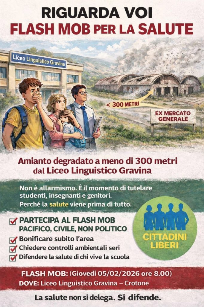 L’associazione “Cittadini Liberi” invita la cittadinanza a partecipare e documentare il flash mob pacifico che si terrà giovedì 5 febbraio 2026, alle ore 8:00, presso il Liceo Linguistico Gravina di Crotone.