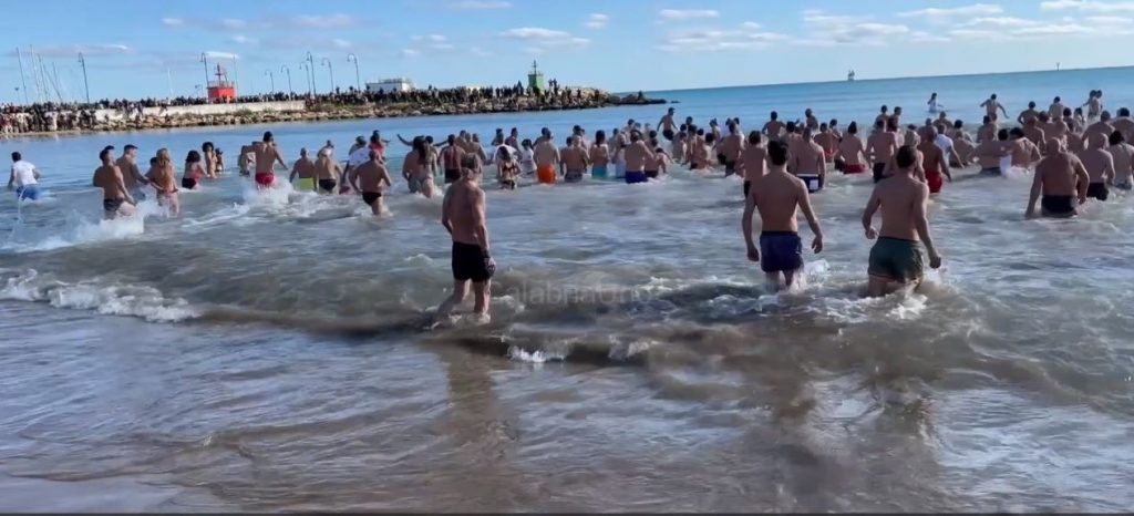 VIDEO – Crotone, il Tuffo di Capodanno sfida il freddo e rinnova la tradizione