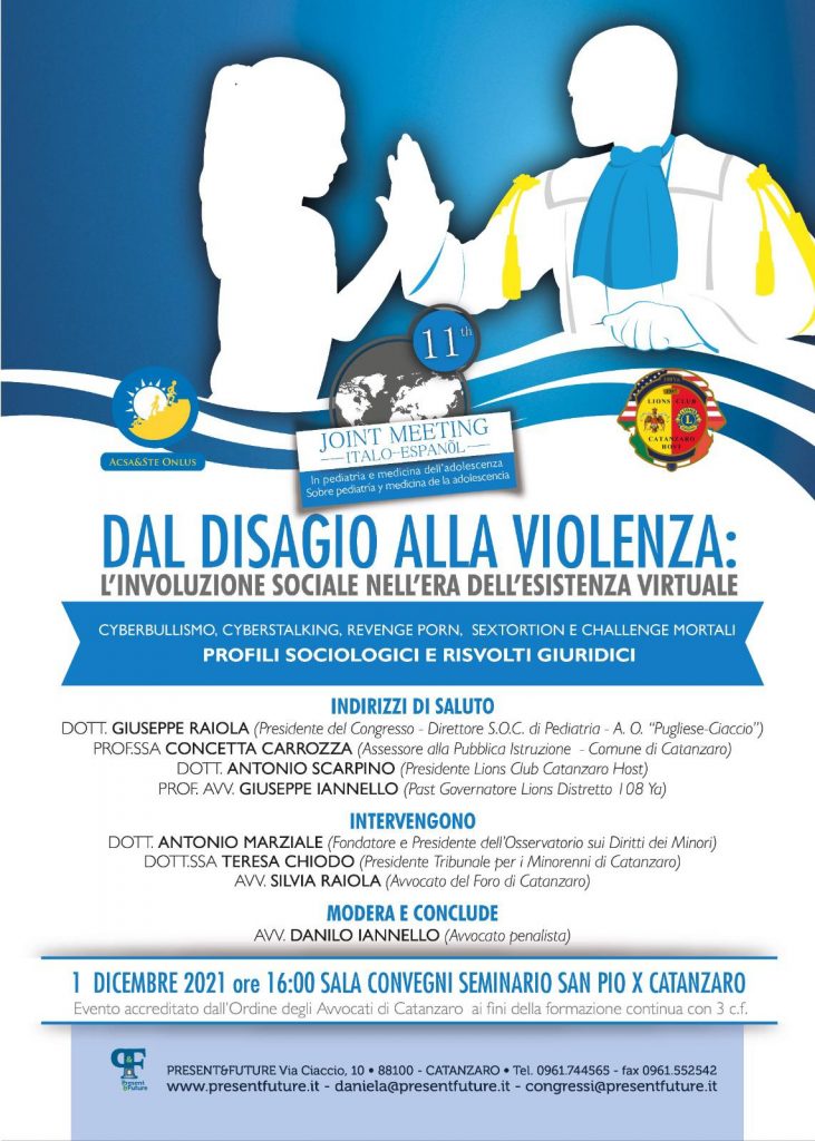 Un evento che anticipa l’avvio della XI edizione del “Joint meeting” congresso in pediatria e medicina dell’adolescenza organizzato dall’Associazione ACSA&STE presieduta dal dottore Giuseppe Raiola, e dal Lions Club Catanzaro Host, che sarà inaugurato giovedì 2 dicembre per concludersi sabato 4. L’evento è stato accreditato dall’Ordine degli Avvocati, e sarà moderato e concluso dall’avvocato Danilo Iannello.