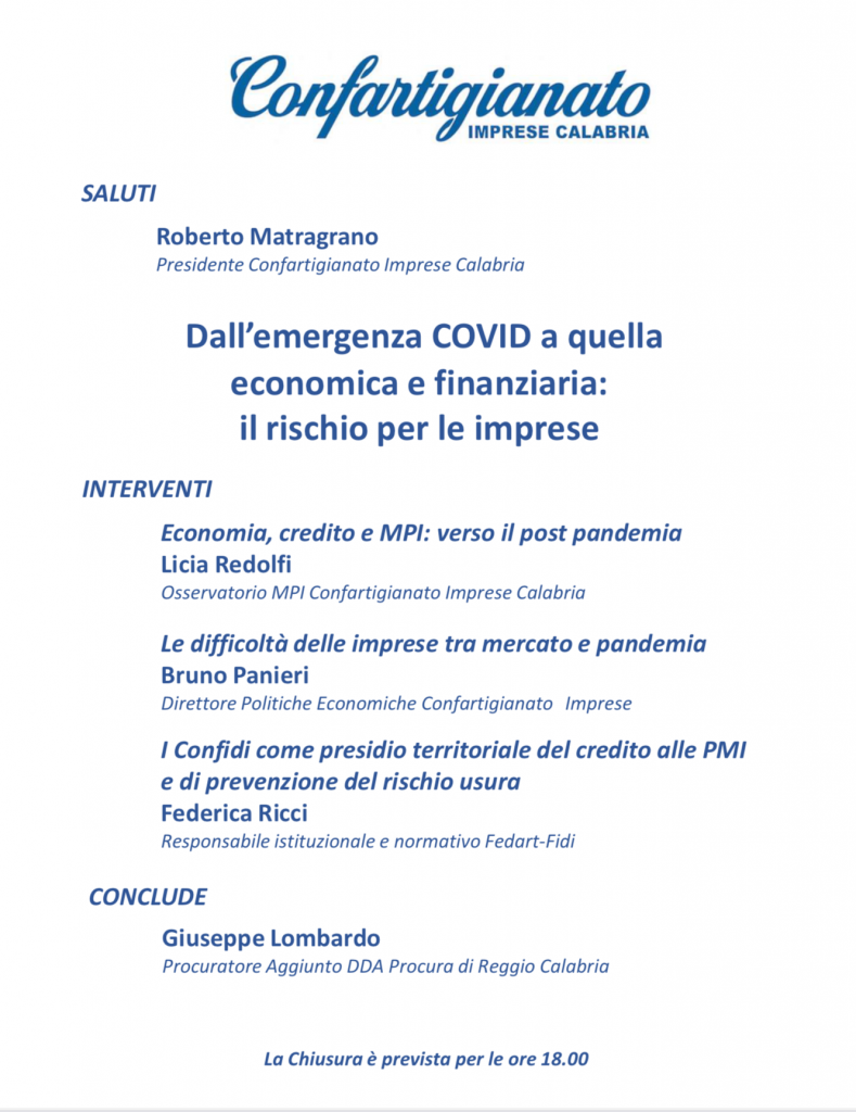CATANZARO – 29 GIUGNO 2021. Sarà concluso dal dottor Giuseppe Lombardo, procuratore aggiunto DDA Procura di Reggio Calabria, il webinar organizzato da Confartigianato Imprese Calabria su un tema molto attuale quanto delicato come il rapporto tra emergenza pandemica e quella economica e le conseguenze sulla tenuta delle imprese. Il tema del webinar che si terrà domani, mercoledì 30 giugno, alle ore 17 si intitola, infatti: “Dall’emergenza Covid a quella economica e finanziaria: il rischio per le imprese”.