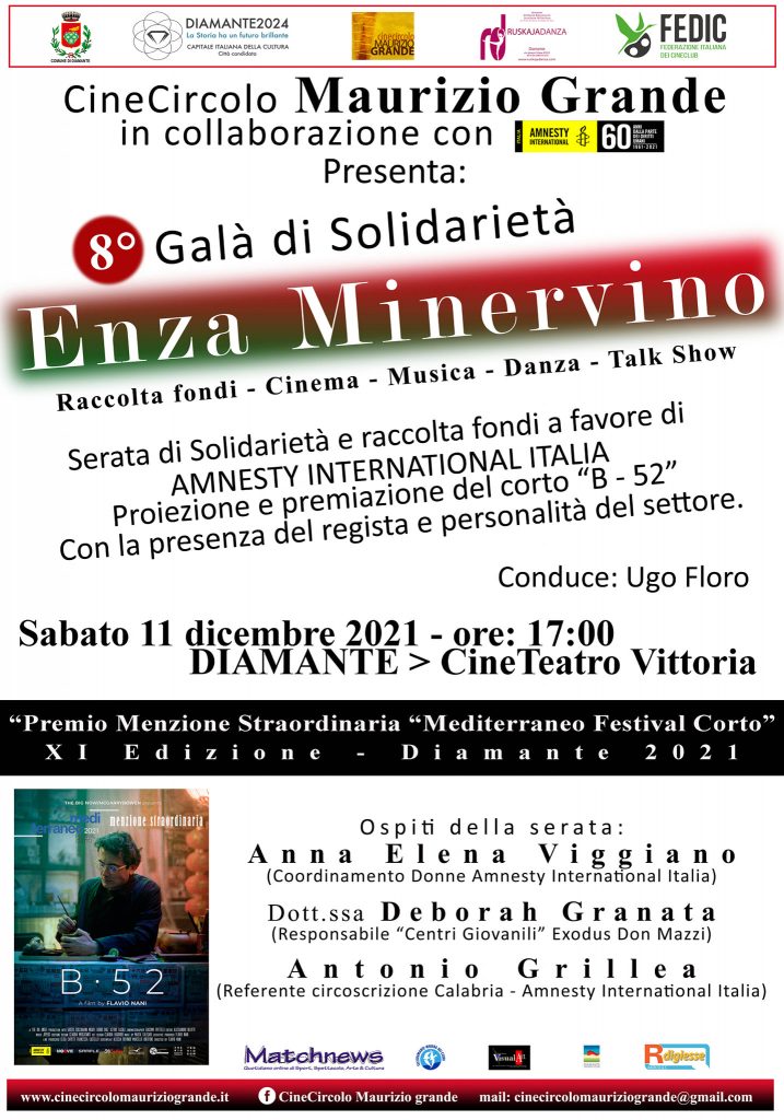 Sabato 11 dicembre alle ore 17.00 presso il Cineteatro Vittoria di Diamante torna, nella sua collocazione invernale, l’appuntamento con il Gran Galà di Solidarietà organizzato dal CineCircolo Maurizio Grande e dedicato all’indimenticata figura di Enza Minervino. Quest’anno l’evento sarà realizzato in collaborazione con la Sezione Italiana di Amnesty International protagonista della serata di raccolta fondi e solidarietà. Ospiti della serata Anna Elena Viggiano del Coordinamento donne Amnesty International; la Dott.ssa Deborah Granata, responsabile dei “Centri giovanili” Exodus di Don Mazzi; Antonio Grillea, Referente della Circoscrizione Calabria di Amnesty International. Impegno sociale e cinema, nel connubio che caratterizza la manifestazione che, anche per questa edizione, sarà condotta con la consueta bravura da Ugo Floro, secondo la formula che ha caratterizzato le scorse edizioni. Nel corso della serata, infatti, viene premiato il corto vincitore della sezione “menzione straordinaria” del “Mediterraneo Festival Corto”, che si svolge ogni anno nel mese di settembre e che poi ispira il tema del Galà di Solidarietà di dicembre. Quest’anno a ricevere il riconoscimento sarà “B 52” di Flavio Nani. Un cortometraggio di finzione per denunciare la pericolosa deriva culturale che si nasconde dietro i crimini d’odio a sfondo razzista e xenofobo. “Siamo orgogliosi di avere la collaborazione della Sezione Italiana di un’organizzazione prestigiosa e importante come Amnesty International – dicono dal Cinecircolo Maurizio Grande – che da sempre è in prima linea nel campo dei diritti umani e che, con il suo impegno, ha ottenuto nel 1977 il Premio Nobel per la Pace. Rivolgiamo a tutti l’invito a partecipare e sostenere chi come Amnesty si batte nel mondo contro ogni violazione dei diritti delle persone”.