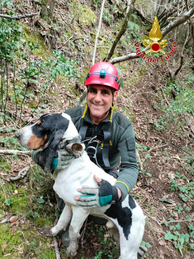 Con tecnica Speleo Alpino Fluviale, unità dei vigili del fuoco effettuava calata fino al corso d’acqua recuperando il cane da caccia di razza pregiata, Gascon Saintongeois, riconosciuta anche dalla FCI.