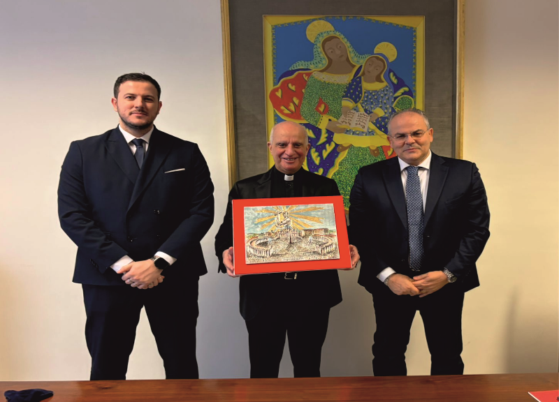 Roma- Si è svolta presso il Palazzo San Pio X, sede del Dicastero per l’Evangelizzazione in via della Conciliazione, la consegna del bassorilievo realizzato dalla maison Michele Affidato a S.E. Mons. Rino Fisichella, Pro‑Prefetto del Dicastero e responsabile dell’organizzazione del Giubileo 2025. L’opera, dal titolo “Cristo: luce che illumina la speranza dell’umanità”, è un bassorilievo in argento smaltato e decorato con foglia d’oro.