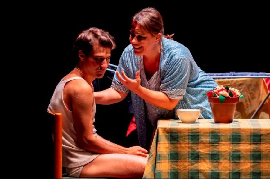 Il titolo, L’angelo del focolare, mette in luce l’ossimoro che da sempre caratterizza l’immagine femminile legata alla casa: custode apparente di affetti e ordini domestici, nella realtà prigioniera di invisibilità e sopraffazione. Sul palco quattro figure senza nome, identificate esclusivamente dai ruoli familiari che incarnano — Moglie (Leonarda Saffi), Marito (Ivano Picciallo), Figlio (David Leone) e Suocera (Giuditta Perriera) — raccontano una vicenda che si ripete come un rituale infernale.