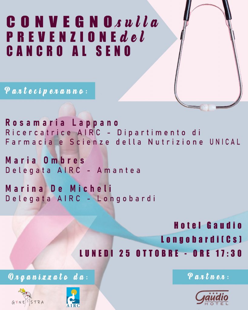 A partecipare al convegno, che si svolgerà nella sala dell’Hotel Gaudio, a Longobardi, saranno: Rosamaria Lappano, Ricercatrice AIRC Dipartimento di Farmacia e Scienze della Nutrizione Unical; Marina De Micheli, delegata AIRC Longobardi; Maria Ombres, delegata AIRC Amantea. Aperta a chiunque voglia prenderne parte, alla serata sono state invitate anche le associazioni del territorio e l’amministrazione comunale.