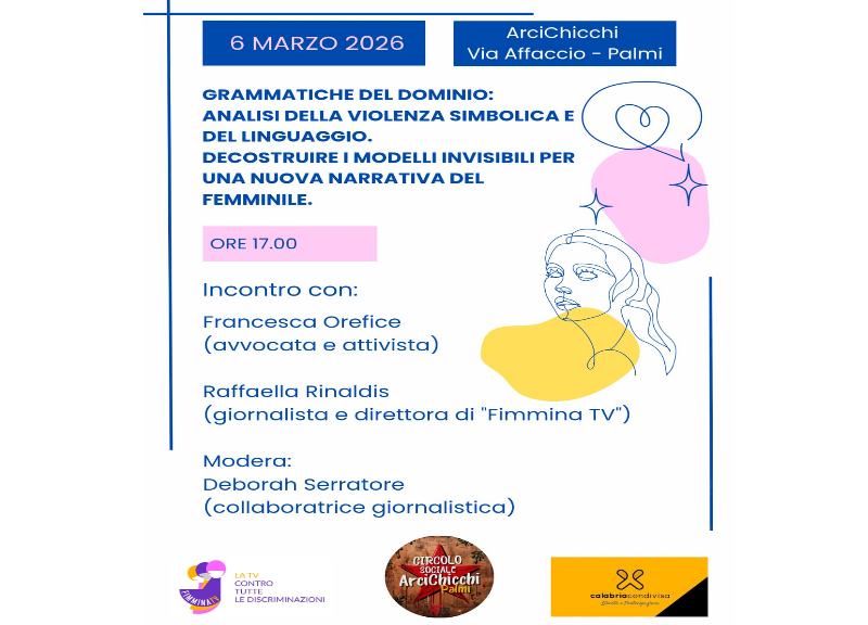 Questo tema cruciale sarà al centro dell’incontro “Grammatiche del dominio. Analisi della violenza simbolica e del linguaggio. Decostruire i modelli invisibili per una nuova narrativa del femminile”, che si terrà giovedì 6 marzo 2026, alle ore 17:00, presso la sede di ArciChicchi in via Affaccio n.3.