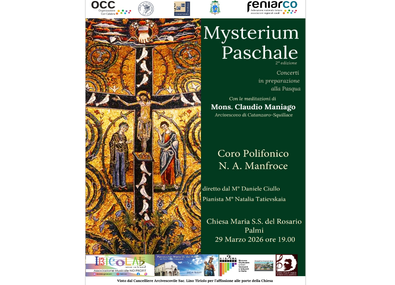 PALMI – Un itinerario sonoro per accogliere la Settimana Santa, unendo la potenza della musica alla profondità della riflessione. Domenica 29 marzo, alle 19:00, la Chiesa Maria SS. del Rosario ospiterà la seconda edizione di “Mysterium Paschale”, un concerto che segna l’avvio delle celebrazioni pasquali nella città. L’evento vedrà protagonista il Coro Polifonico “N. A. Manfroce”, diretto dal maestro Daniele Ciullo, con l’accompagnamento al pianoforte della maestra Natalia Tatievskaia.