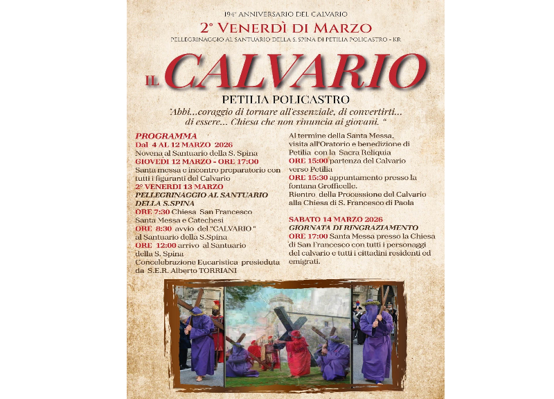 PETILIA POLICASTRO – La comunità di Petilia Policastro si prepara a rivivere uno dei suoi momenti più intensi e sentiti: la celebrazione del “Calvario”, la storica manifestazione religiosa che quest’anno giunge alla sua 194ª edizione. L’evento, in programma per il 13 e 14 marzo, è organizzato dal Comune in collaborazione con il gruppo Natess, la Famiglia Mariana “Le 5 Pietre” e gli Ardorini, e culminerà nel pellegrinaggio al Santuario della Santa Spina.