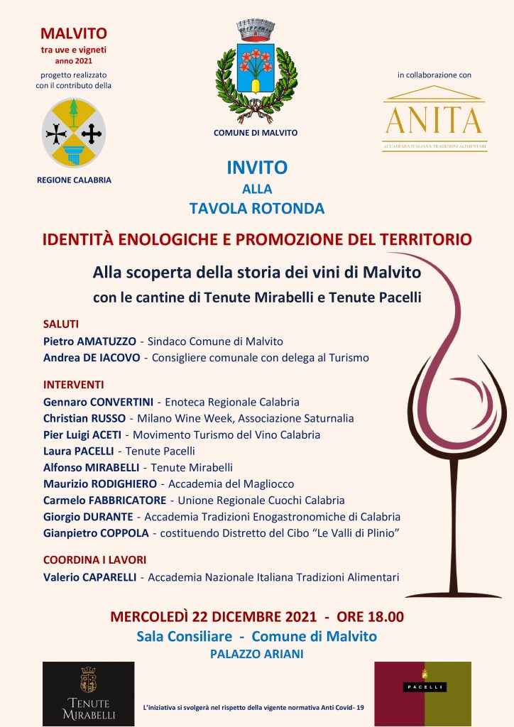 Un parterre di relatori esperti degno dei grandi appuntamenti quello che l’Accademia Nazionale Italiana Tradizioni Alimentari ha composto su indicazione del Comune di Malvito in vista dell’evento “Identità enologiche e promozione enoturistica del territorio – Alla scoperta della storia dei vini di Malvito con le cantine di Tenute Mirabelli e Tenute Pacelli”, incluso nel programma dell’edizione 2021 “Malvito tra uve e vitigni”, progetto realizzato con il contributo economico della Regione Calabria, che si terrà mercoledì 22 dicembre 2021, alle ore 18.00, presso la sala consiliare del piccolo borgo dell’alta Valle dell’Esaro, meglio conosciuto come Palazzo Ariani.