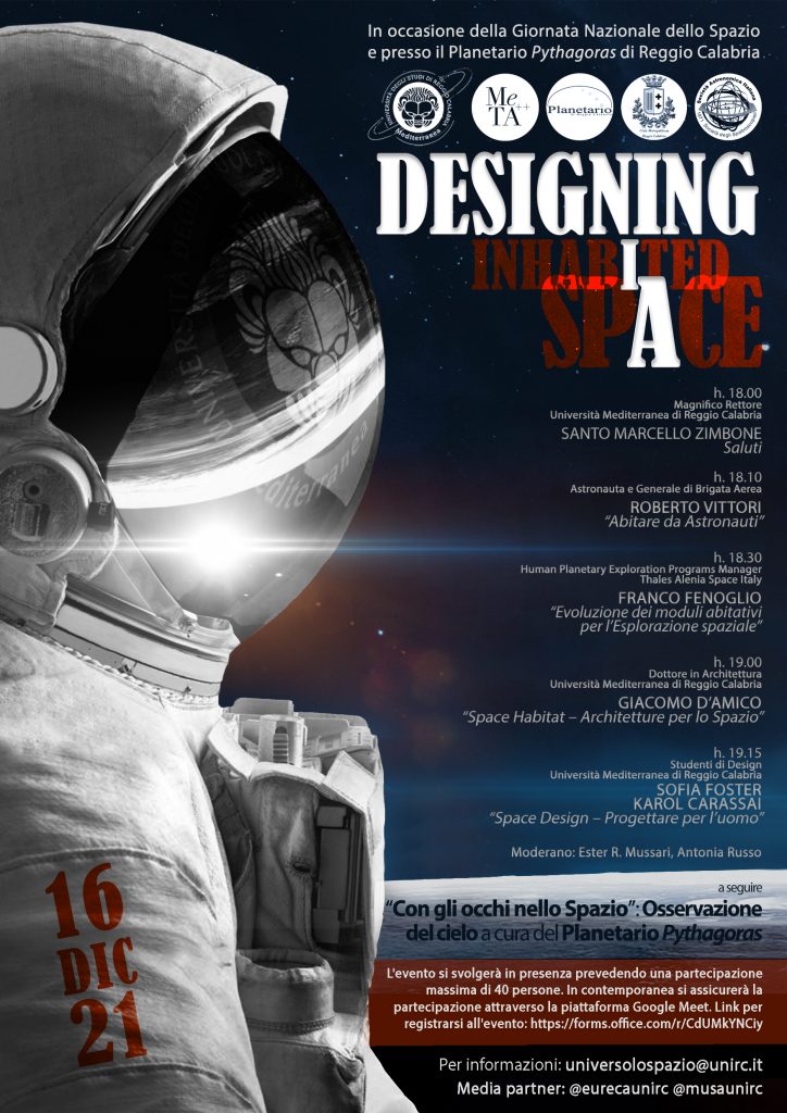 Il 16 dicembre avrà luogo l’evento “Designing InhabIted SpAce” organizzato in occasione della Giornata Nazionale dello Spazio. L’evento vuole proporsi come il primo di una serie di iniziative incentrate sulla tematica della vita nello Spazio e finalizzate all’introduzione dell’argomento negli ambiti accademico e scolastico.