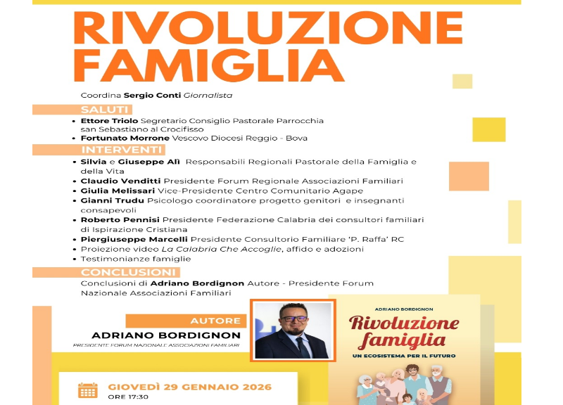 REGGIO CALABRIA – Quali elementi sono necessari alla famiglia per essere non solo luogo di cura e amore, ma anche una risorsa strategica per il Paese e le comunità locali? A questa domanda risponde il libro “Rivoluzione famiglia” di Adriano Bordignon, che sarà al centro di un incontro pubblico giovedì 29 gennaio, alle ore 17:30, nel salone parrocchiale della Chiesa di San Sebastiano al Crocifisso.