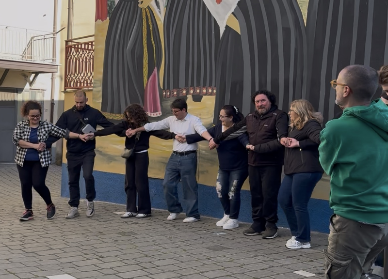 Il momento più toccante e simbolico si è vissuto davanti al murale dedicato a Paolo Staltari. In un gesto di unione che ha superato ogni confine, visitatori e residenti si sono uniti nella Vagha, l’antica danza arbëreshe, trasformando la piazza in un palcoscenico di memoria, identità e fratellanza.