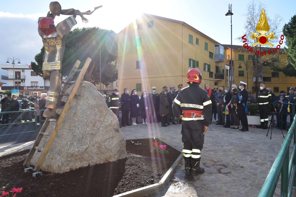 L’opera realizzata dal Maestro Vibonese Antonio La Gamba raffigura un Vigile del Fuoco in cima ad una scala che protende le